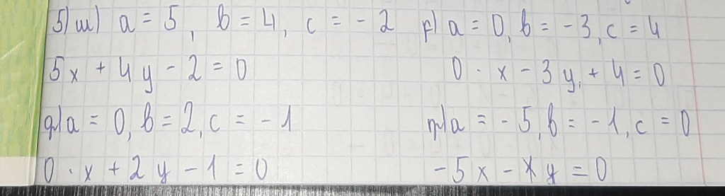 2․Որոշիր 2x+y−5=0 երկու անհայտներով գծային հավասարման a, b և c գործակիցները: