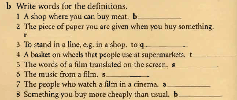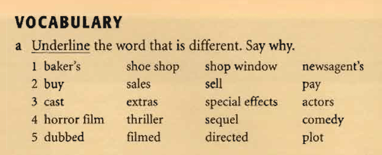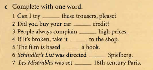 1) Can I try on these trousers, please? 2) Did you buy your car bycredit? 3) People always complain of high prices. 4) If it’s broken, take it back to the shop. 5) The film is based on a book. 6) Shindler’s List was directed by Spielberg. 7) Les Misérables was set in18th century Paris.